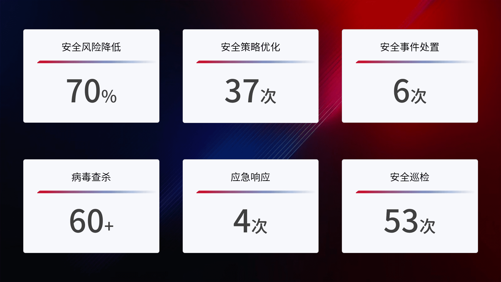 提供全面的安全事件报告体系,,包括处置报告、、、、周报、、季度和年度总结,,,结合持续监控,,帮助客户深入了解网络安全状况。。。